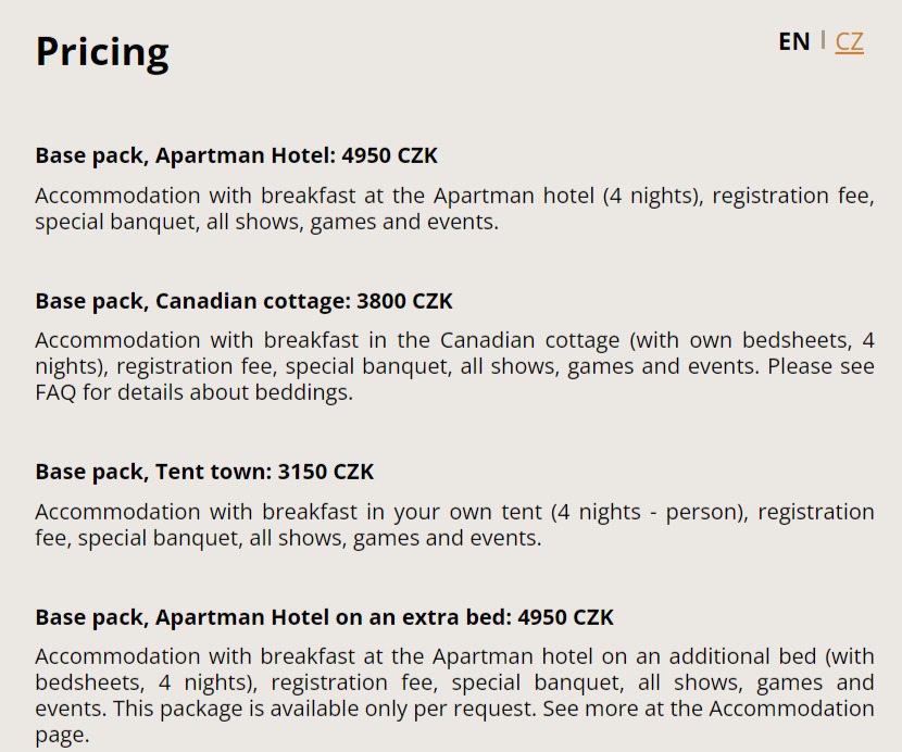 Accommodation with breakfast in the Canadian cottage (with own bedsheets, 5 days / 4 nights), registration fee, special banquet, all shows, games and events. Please see FAQ for details about beddings.