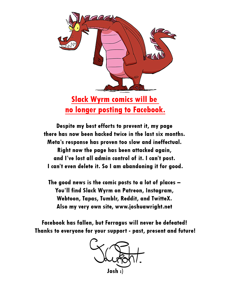 Comic Driven Off Facebook by Hacker: Slack Wyrm 01/12/2024 Ahmar Wolf If you guess by someone with a link to a porn site you would be correct, worst of all twice by the same hacker. Share this: Click to share on Pinterest (Opens in new window) Pinterest Click to share on Facebook (Opens in new window) Facebook Click to share on X (Opens in new window) X Click to share on Tumblr (Opens in new window) Tumblr More Click to share on LinkedIn (Opens in new window) LinkedIn Click to print (Opens in new window) Print Click to email a link to a friend (Opens in new window) Email Like Loading...